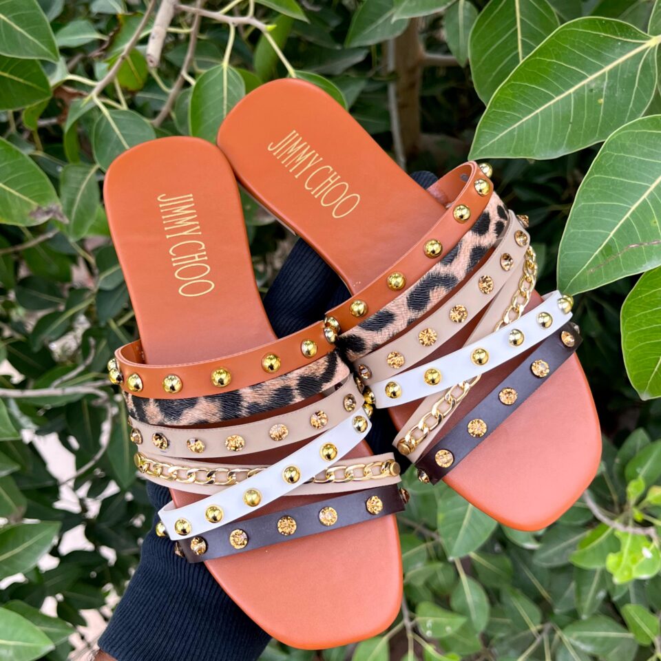Jimmy Choo Style Studded Multi-Strap Flat Slide
