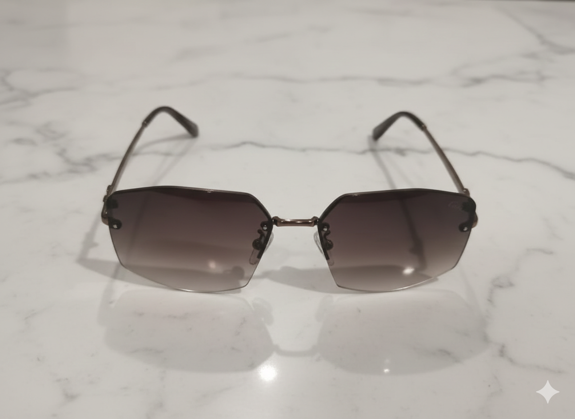 Bold yet refined, these Cartier geometric rimless sunglasses showcase a modern luxury aesthetic. Featuring softly angular lenses with a sleek metal bridge and minimal frame detailing, this design reflects Cartier’s signature elegance with a contemporary edge—perfect for premium everyday wear.