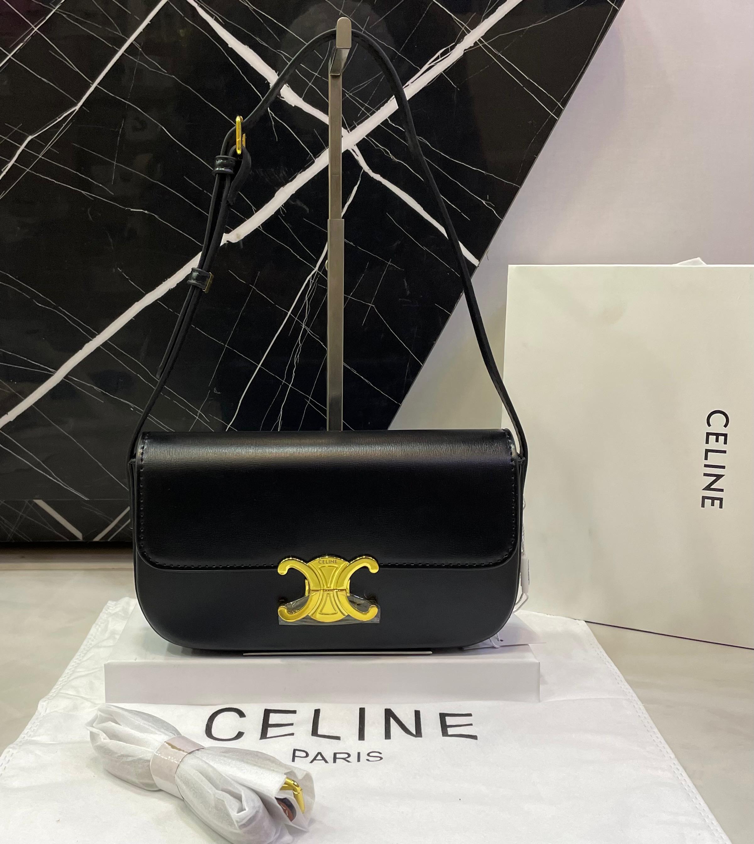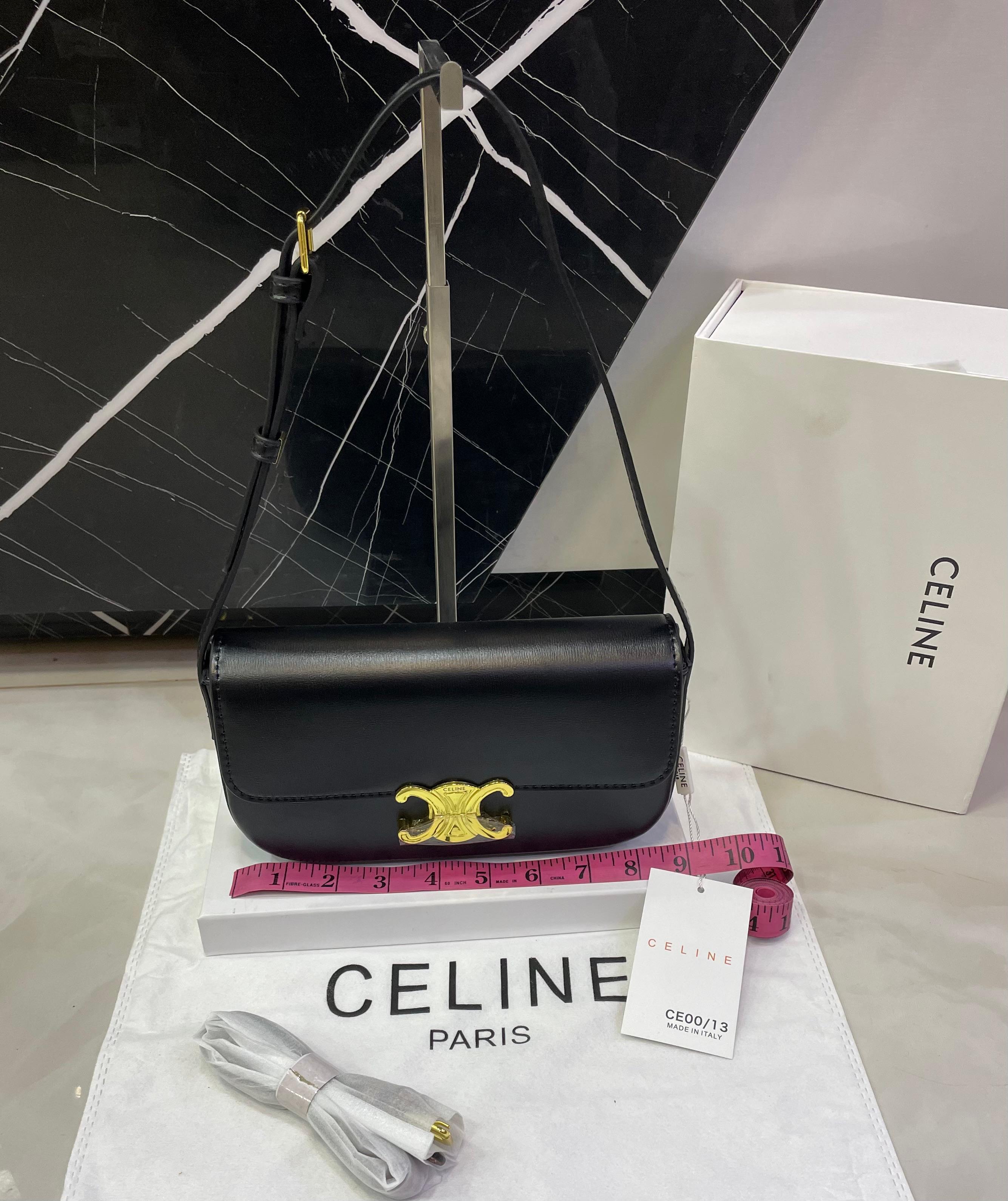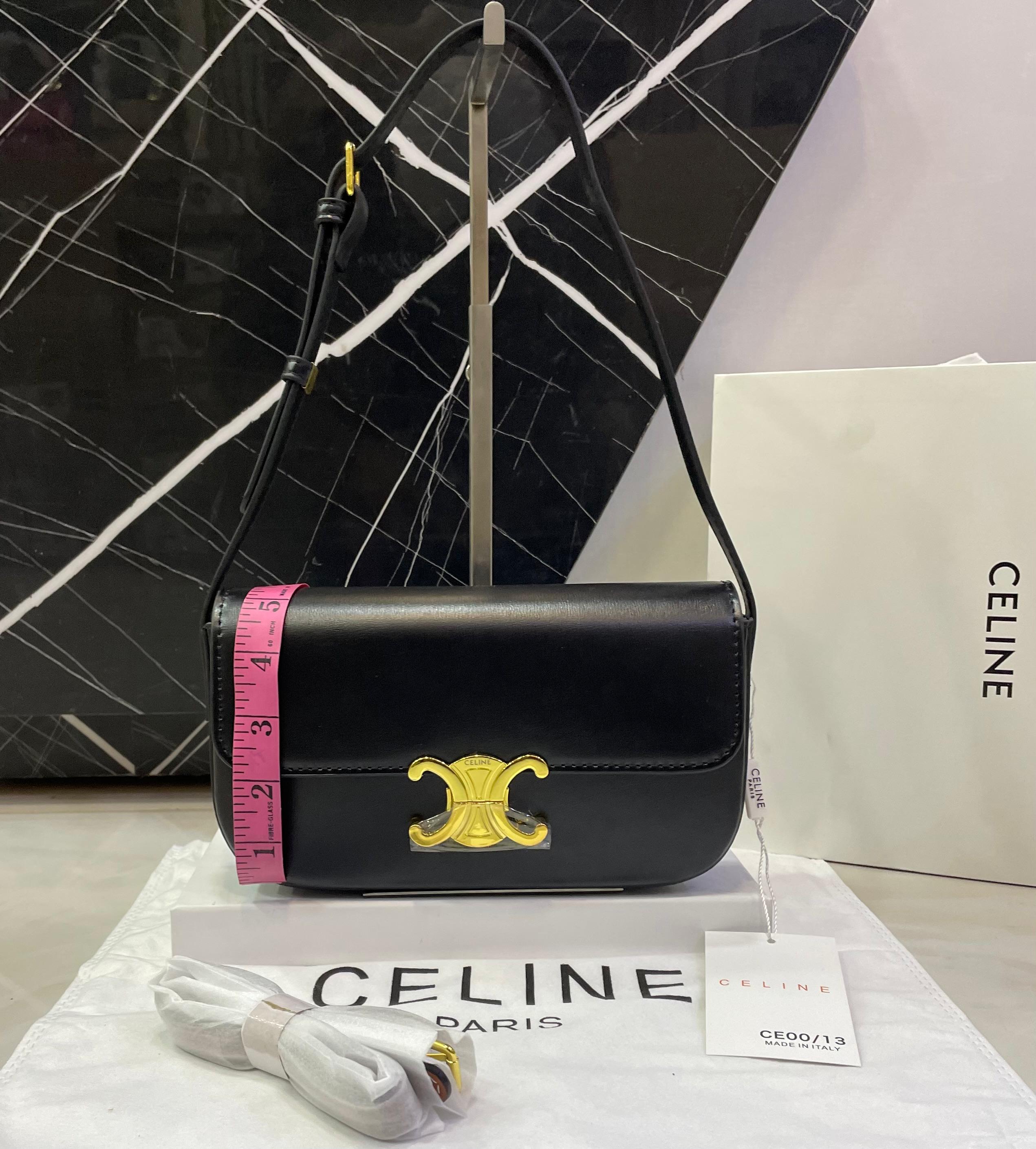 Classic CELINE Triomphe flap shoulder bag featuring the signature Triomphe gold clasp hardware and structured rectangular silhouette. One of CELINE’s most iconic modern heritage designs.