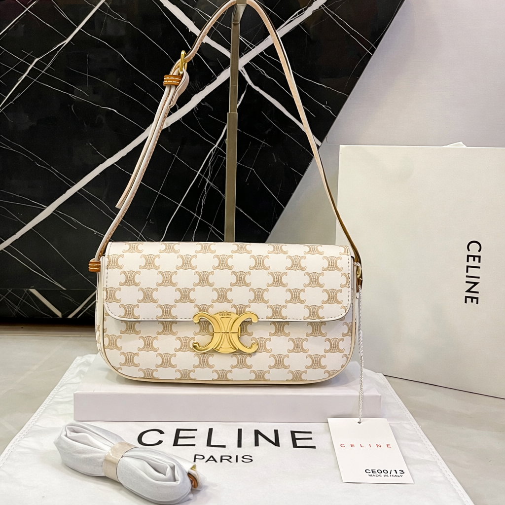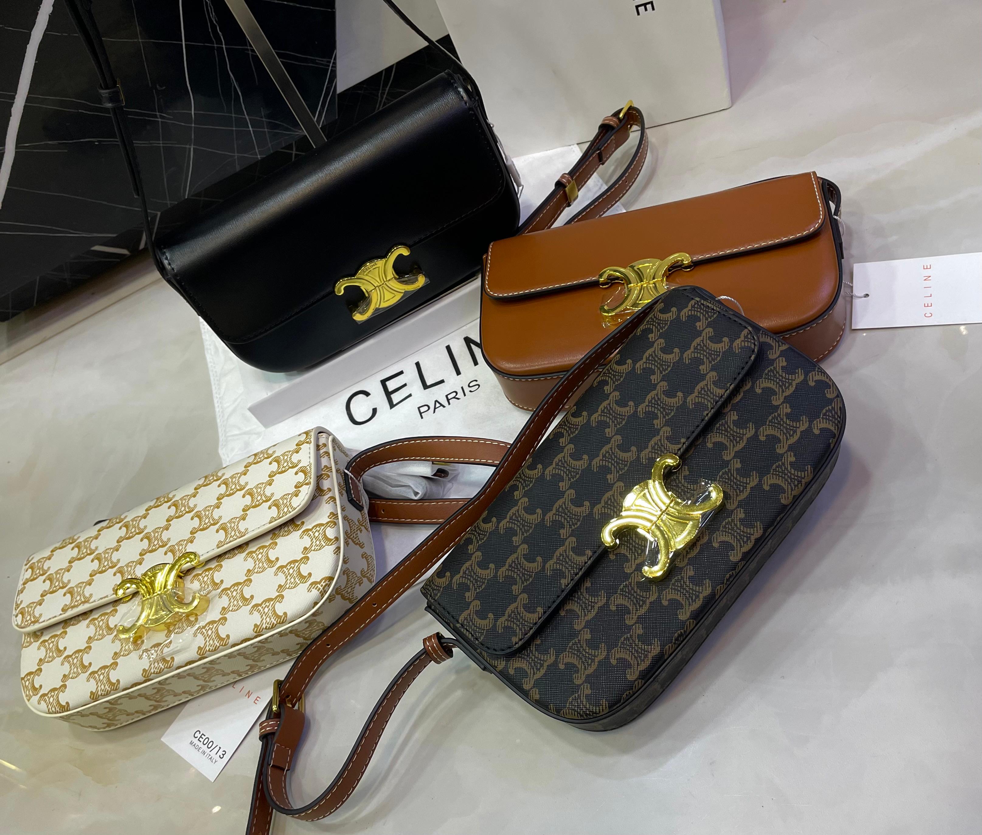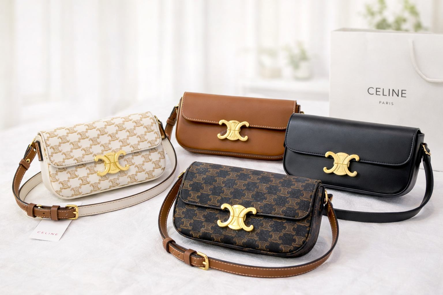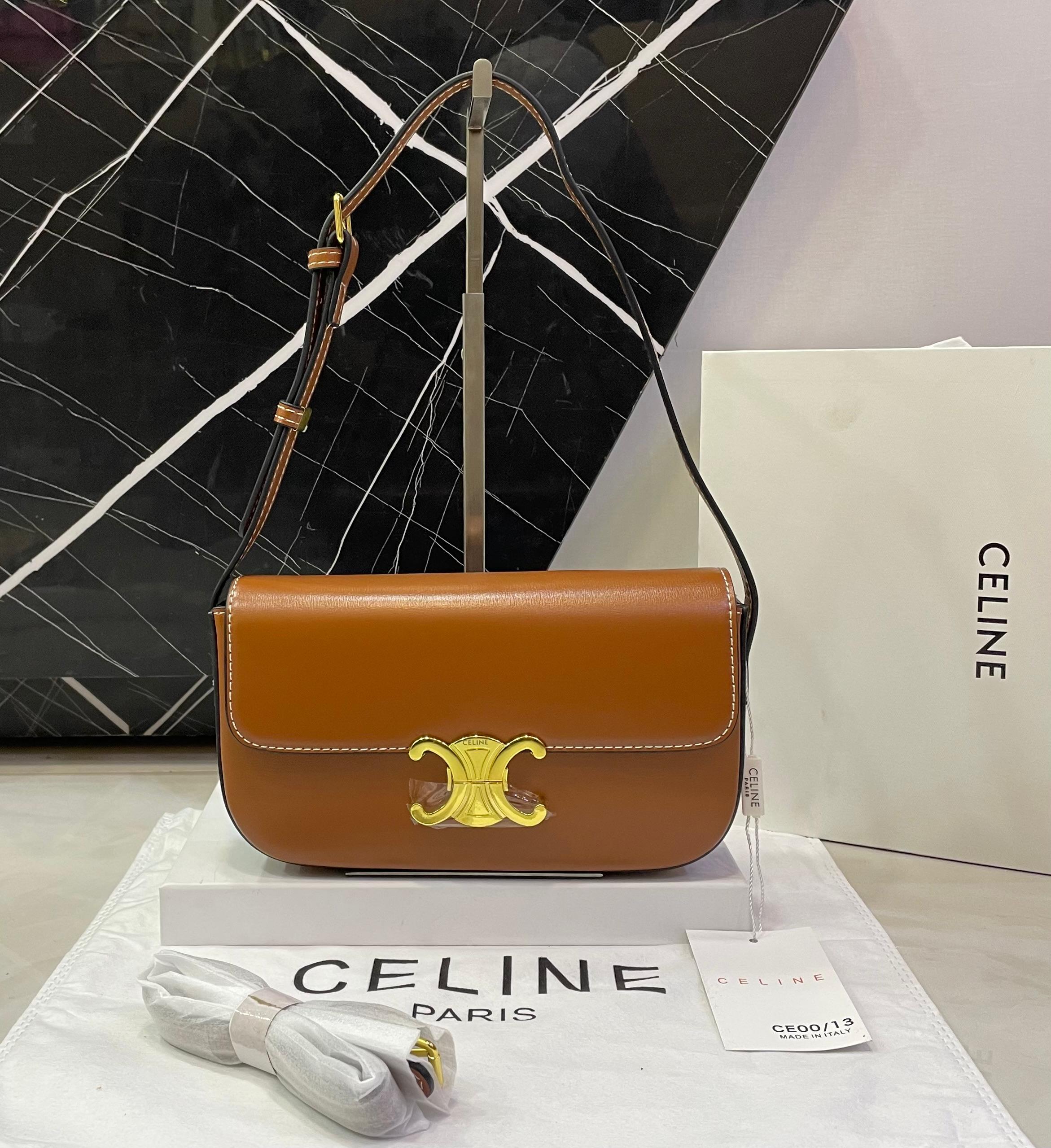 Classic CELINE Triomphe flap shoulder bag featuring the signature Triomphe gold clasp hardware and structured rectangular silhouette. One of CELINE’s most iconic modern heritage designs.