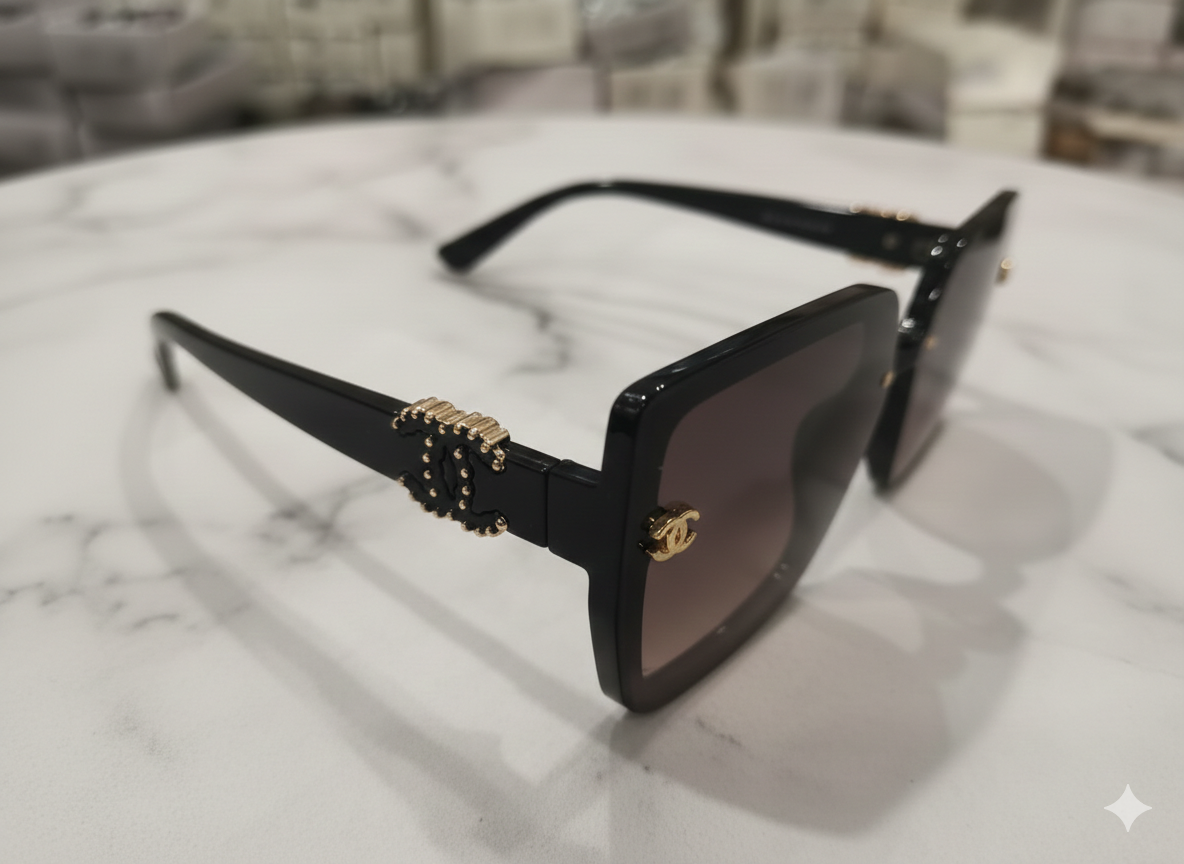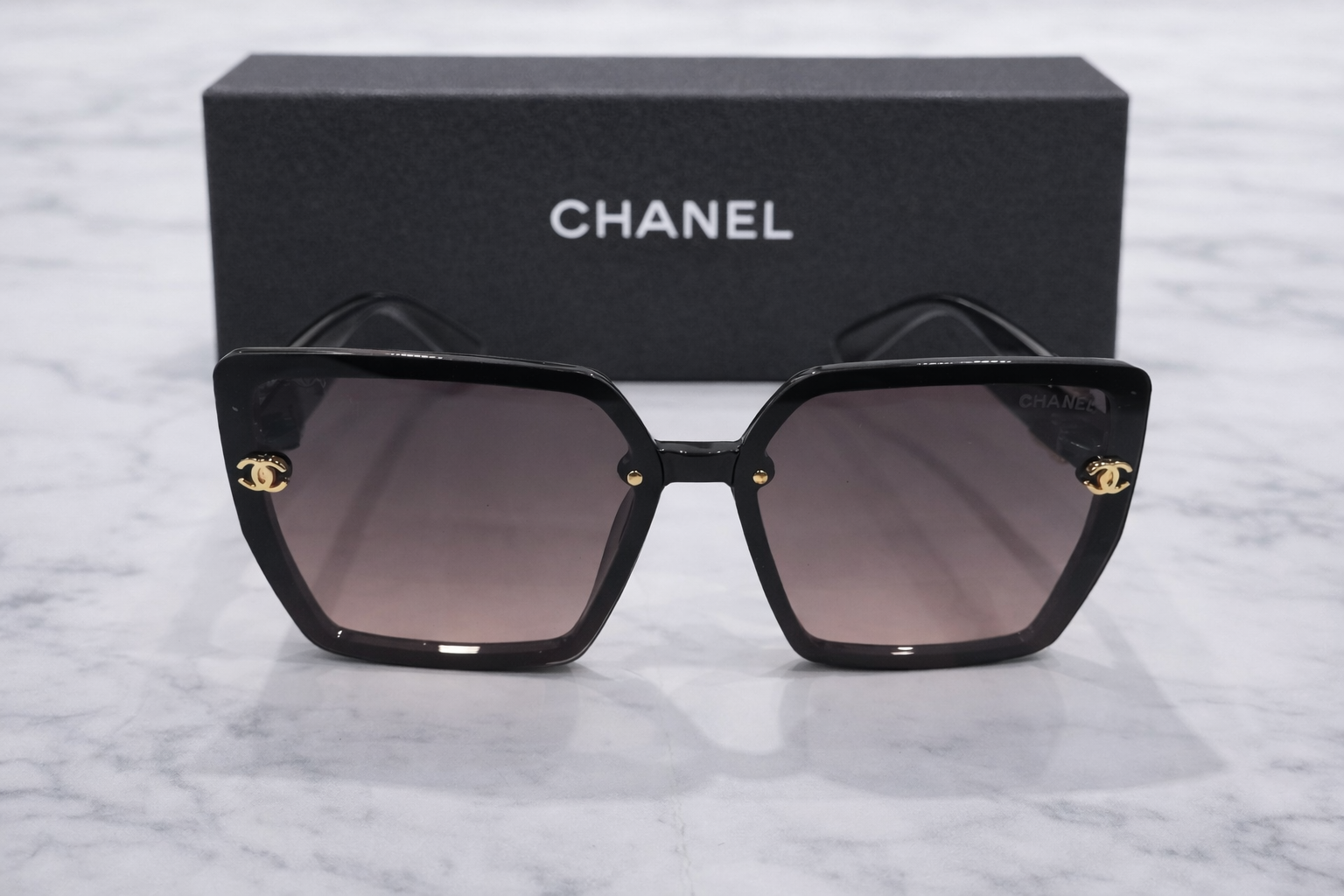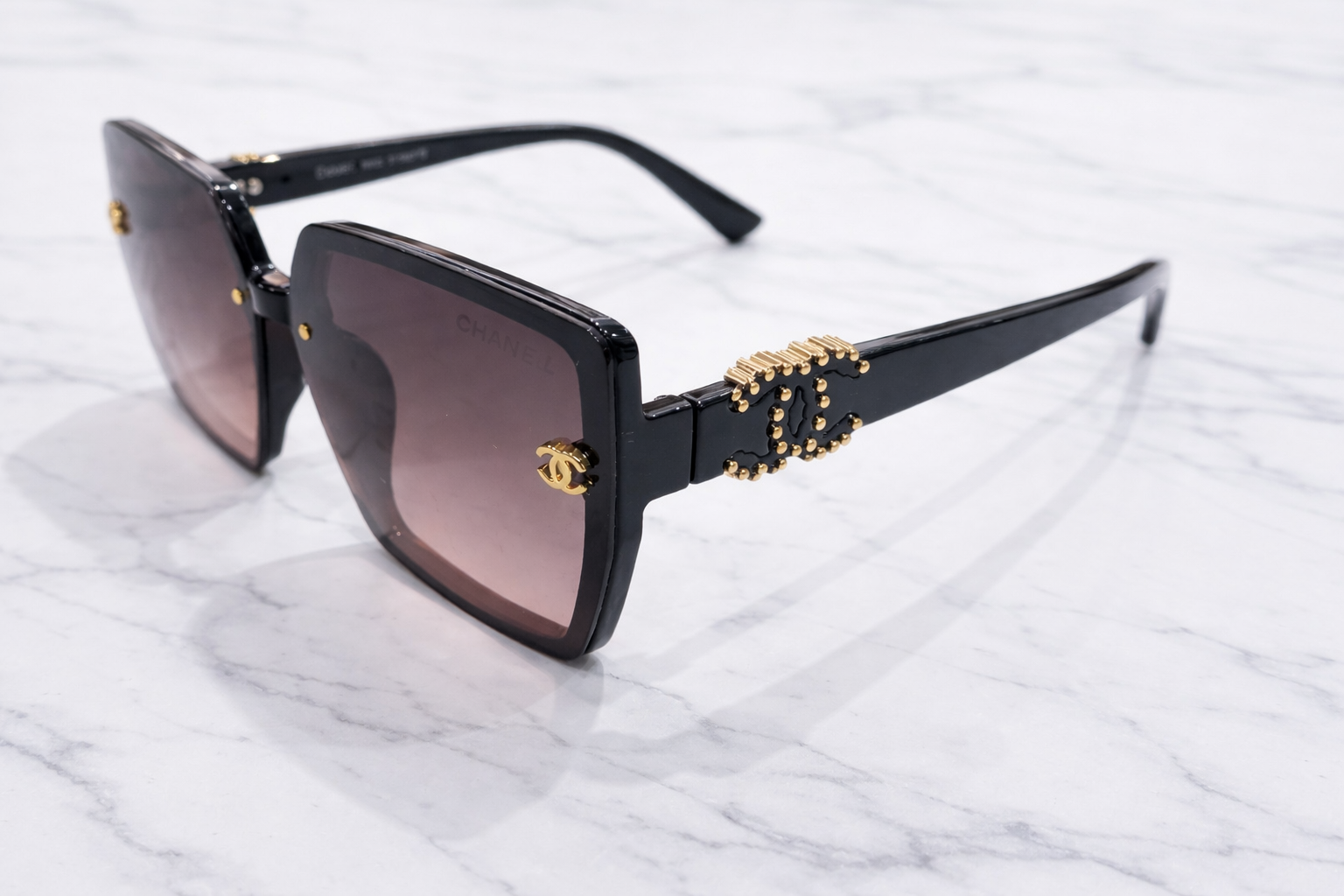 These Chanel-inspired oversized square sunglasses feature a bold black frame paired with soft gradient lenses. The iconic gold-tone CC logo on both sides adds a signature luxury statement, making them perfect for elevated everyday styling and high-fashion looks.