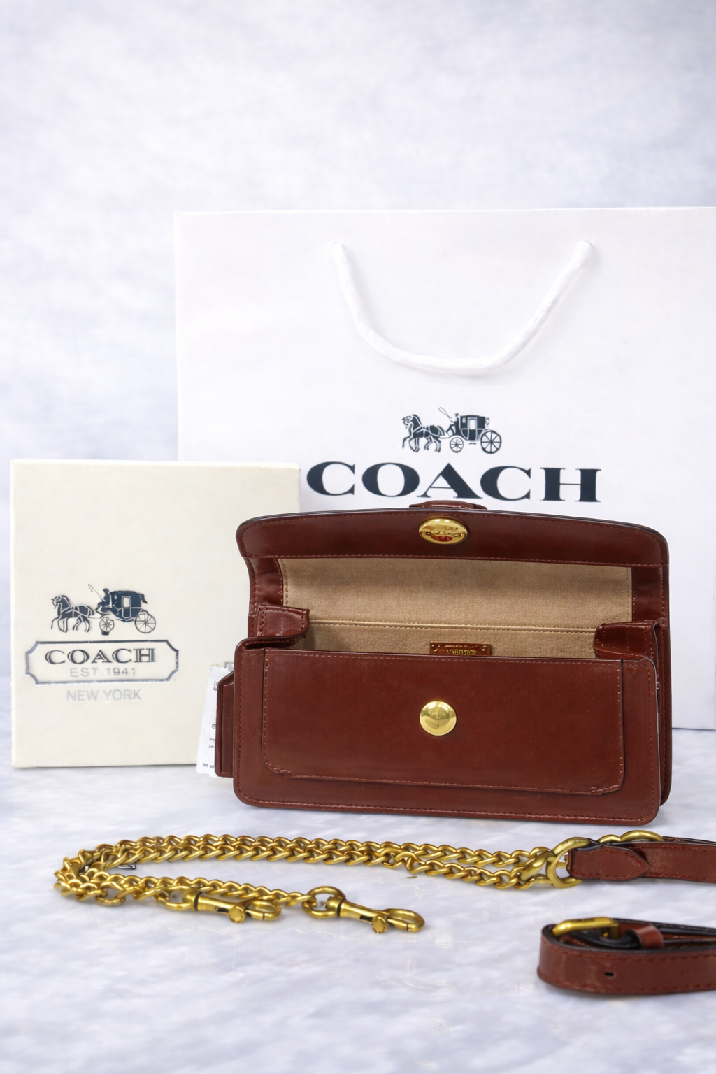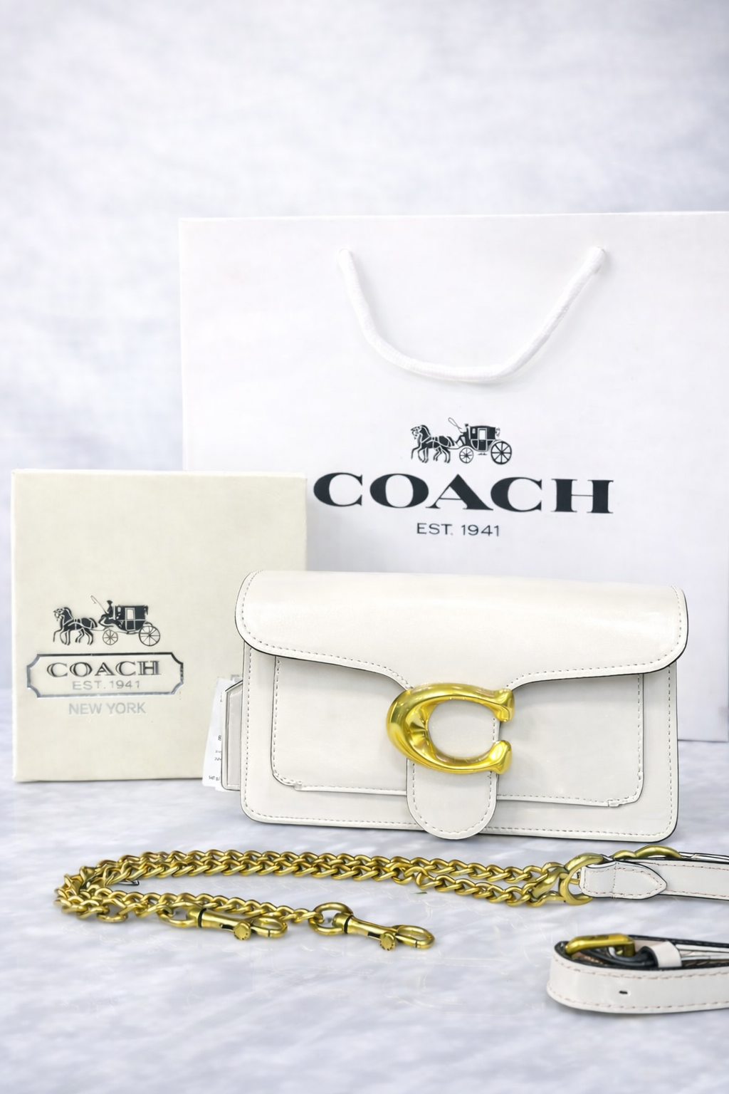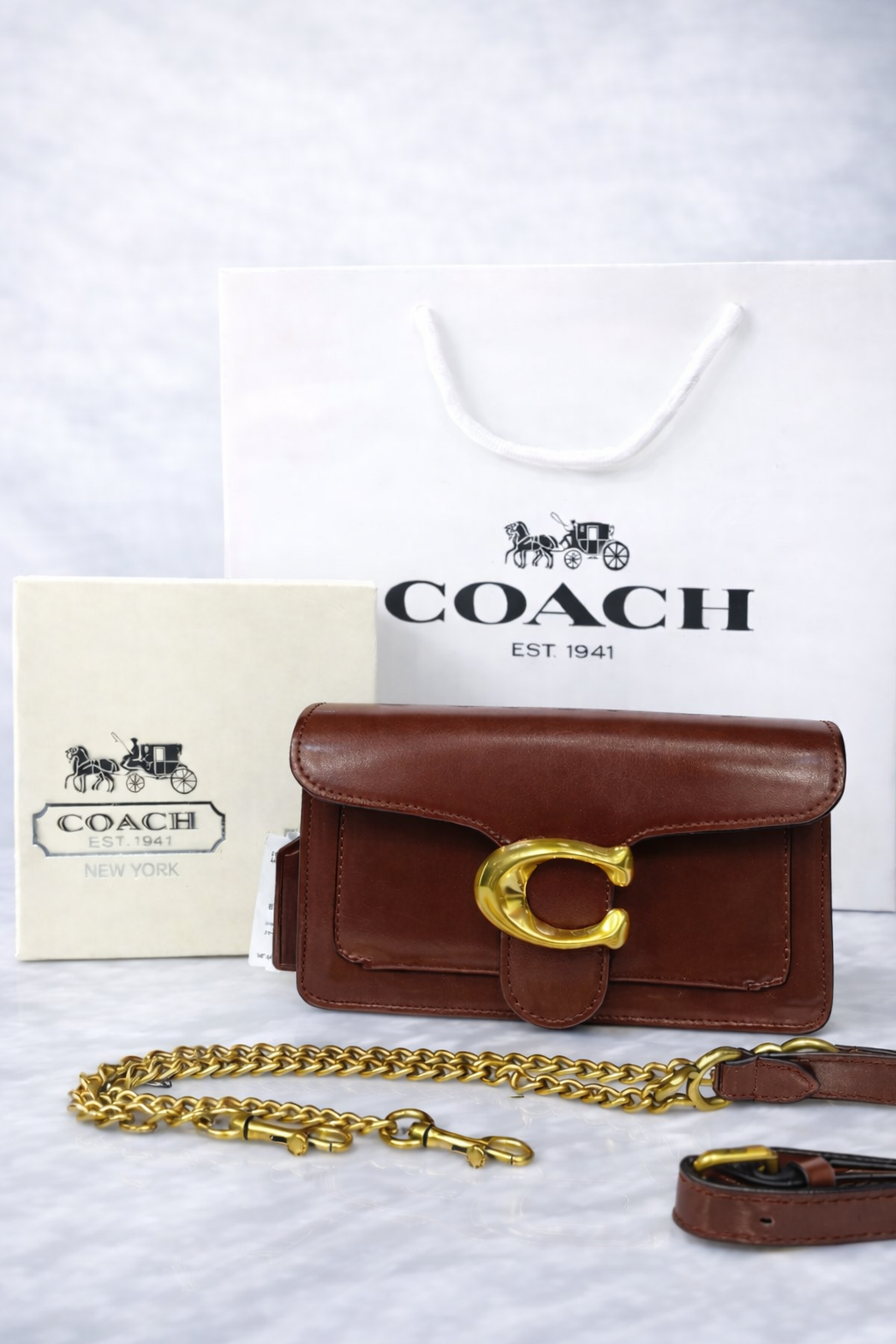 Compact structured shoulder bag inspired by the iconic Tabby silhouette from Coach. Features smooth polished leather, signature “C” hardware, and interchangeable straps — designed for everyday premium styling with a modern vintage look.