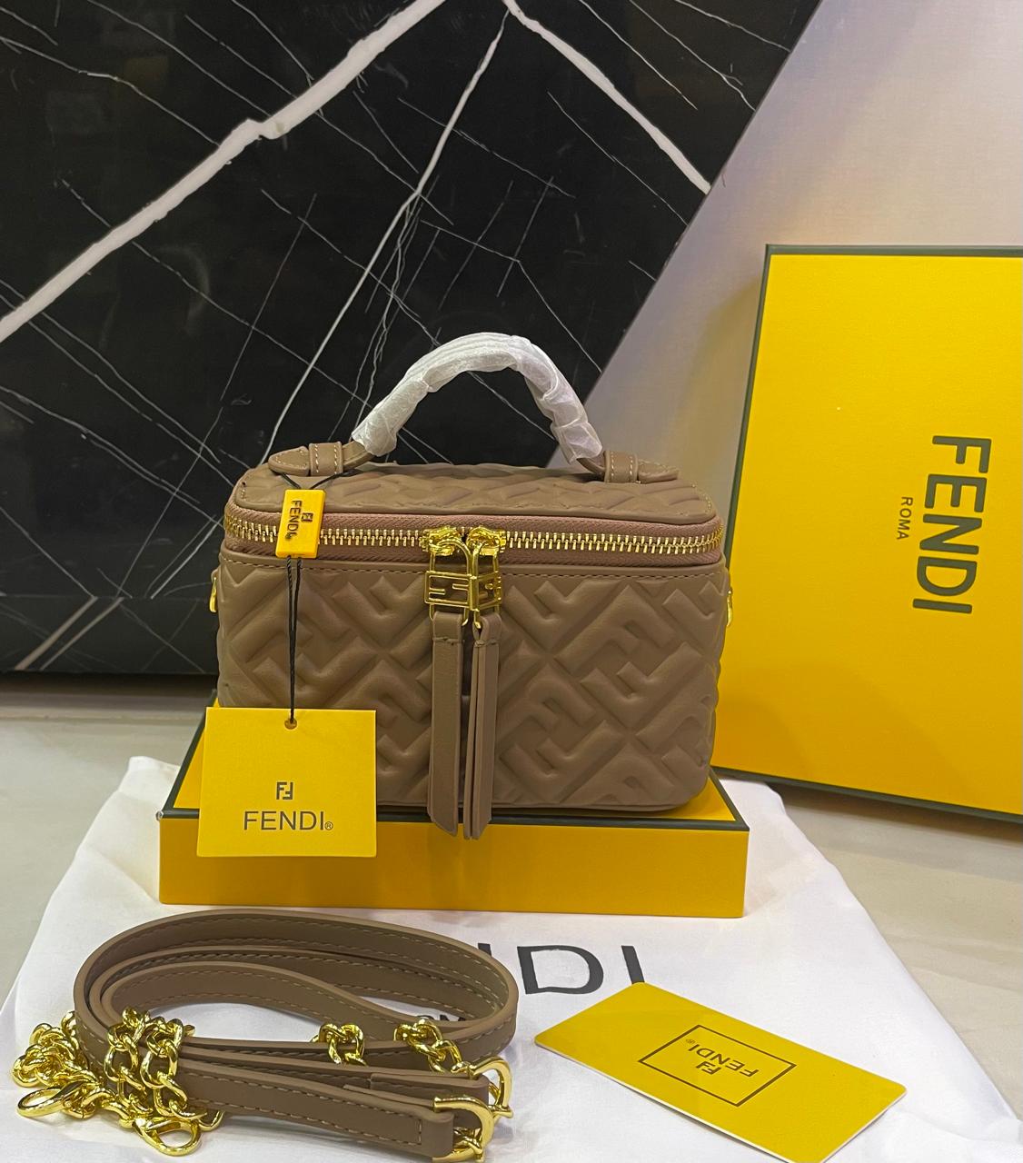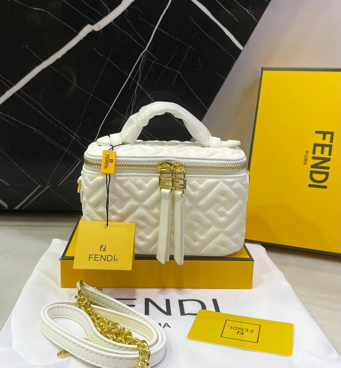 This Fendi-style mini top-handle bag features the iconic FF monogram and embossed pattern, designed in a compact, structured silhouette. Finished with dual gold-tone zip closures and a detachable strap, it blends statement luxury with everyday functionality—perfect for on-the-go styling.