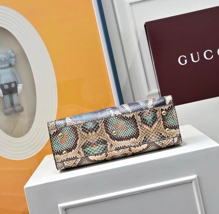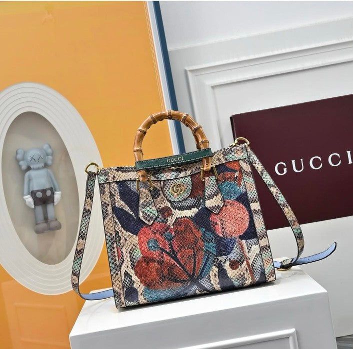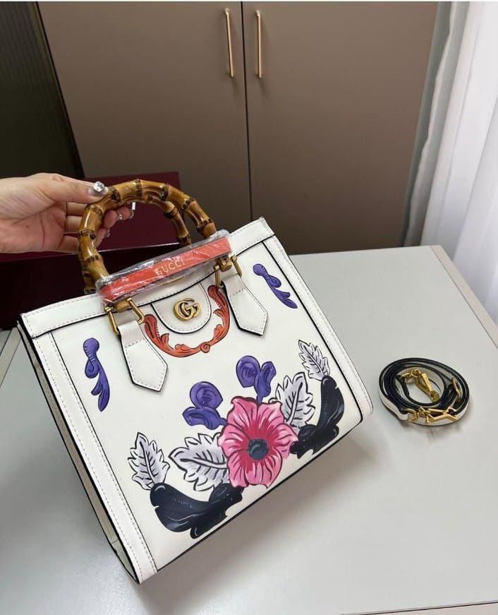 Structured top-handle handbag from Gucci featuring the iconic bamboo handle and bold floral print artwork. A statement luxury piece combining classic Gucci heritage with artistic detailing and modern structure.