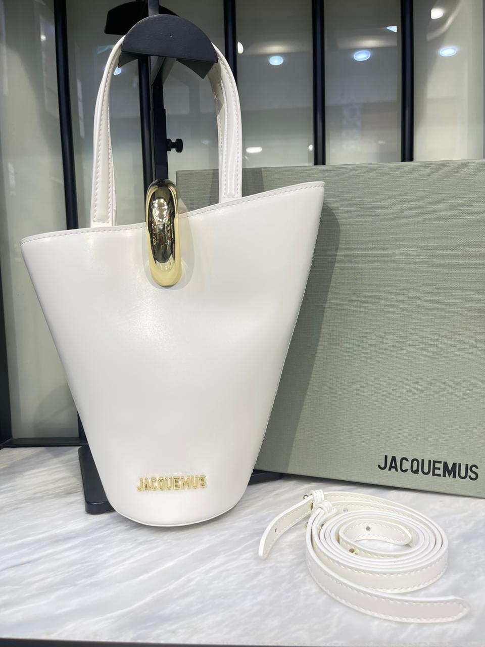 Jacquemus The Small Bambola is a structured mini tote inspired by sculptural bucket shapes, featuring smooth leather construction and signature oversized oval gold hardware detail for a bold minimalist luxury look.