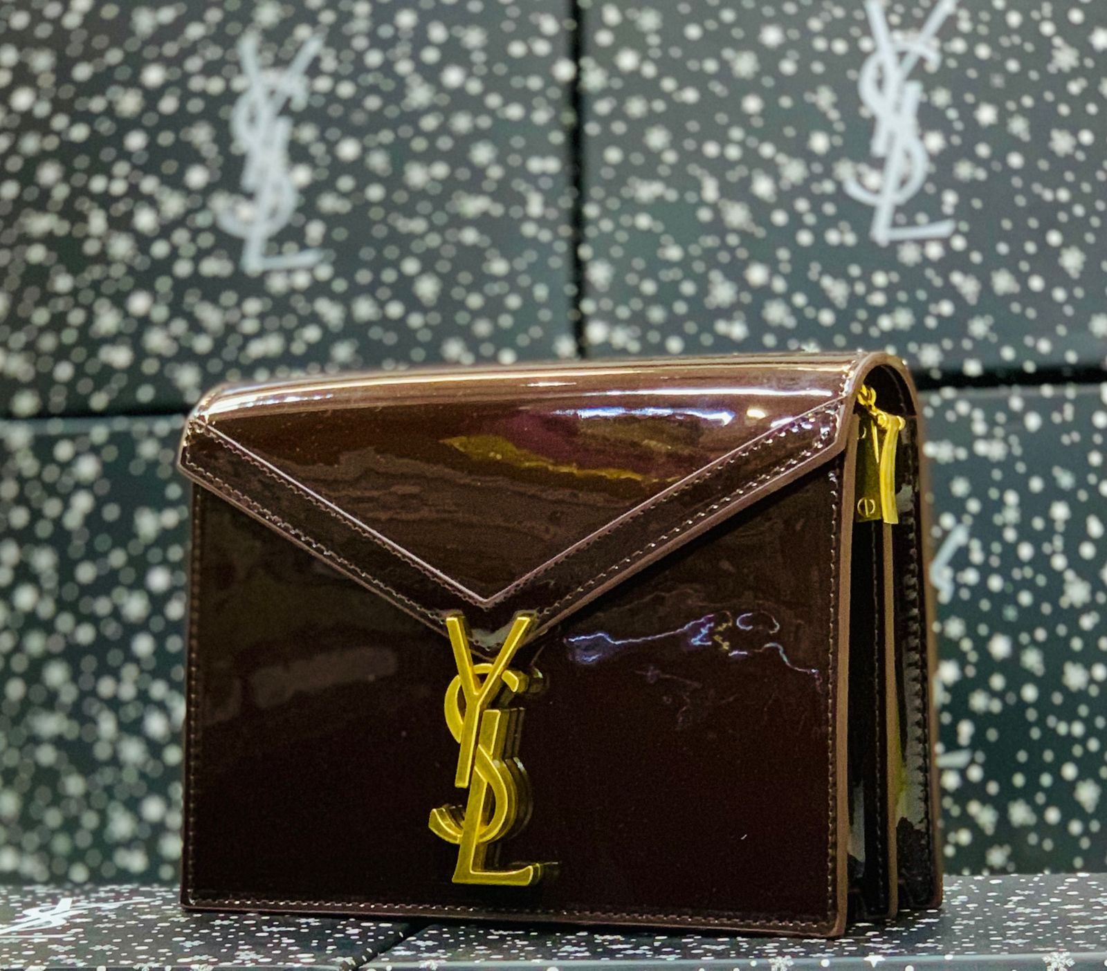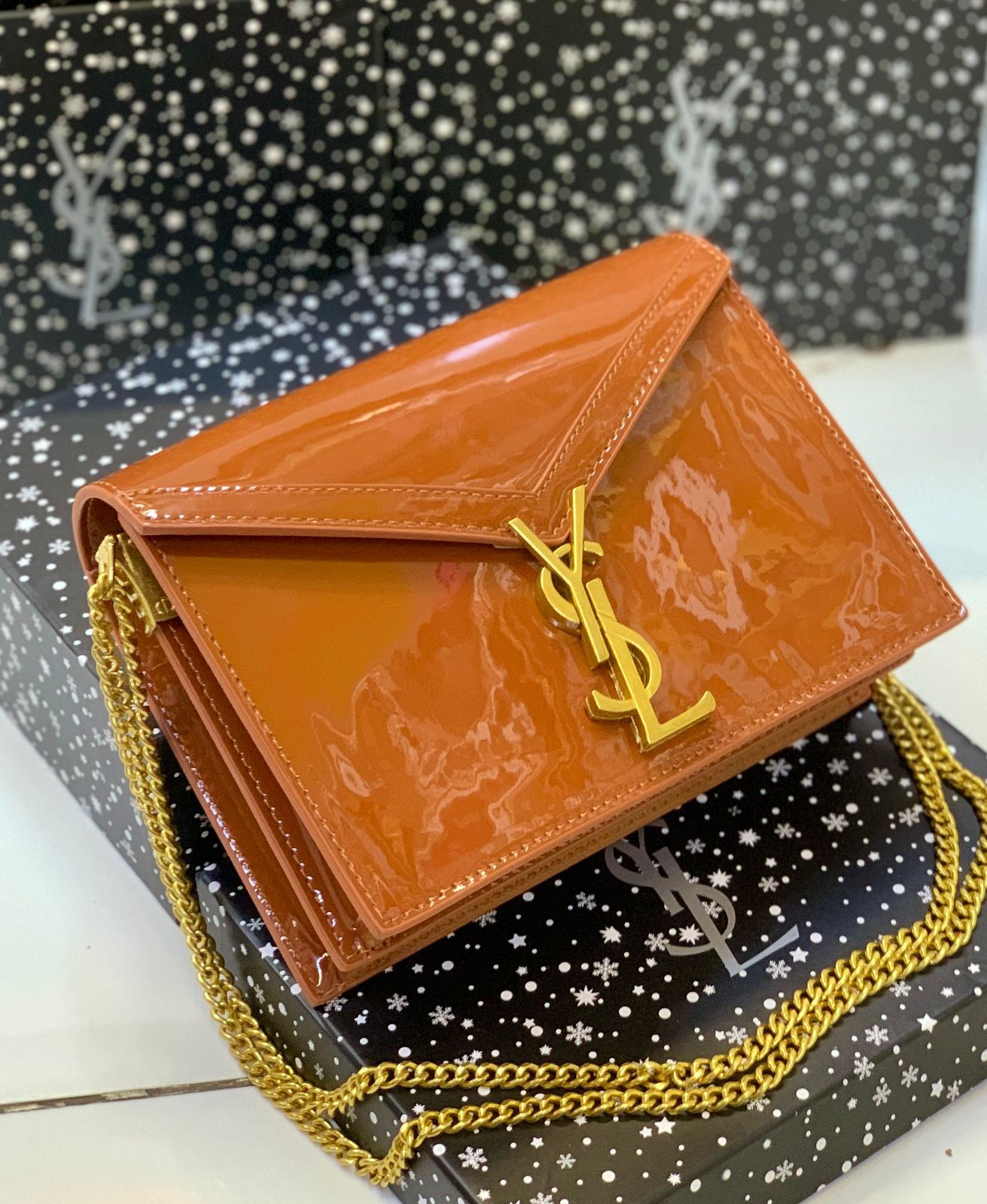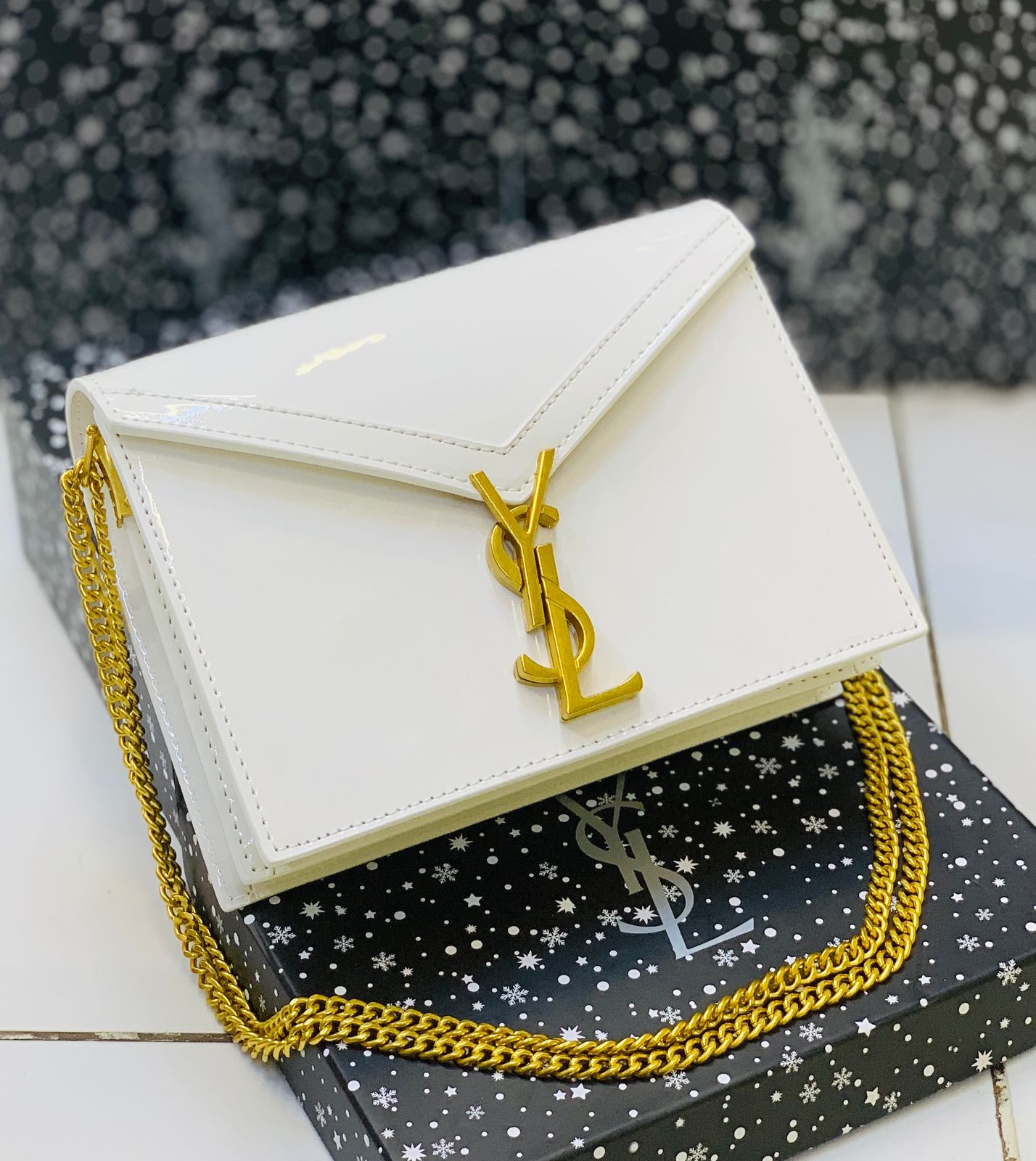 Elegant structured shoulder bag featuring a glossy patent finish and bold front monogram hardware detail. Designed with a sleek envelope silhouette and chain strap, this bag delivers a premium luxury-inspired statement look.