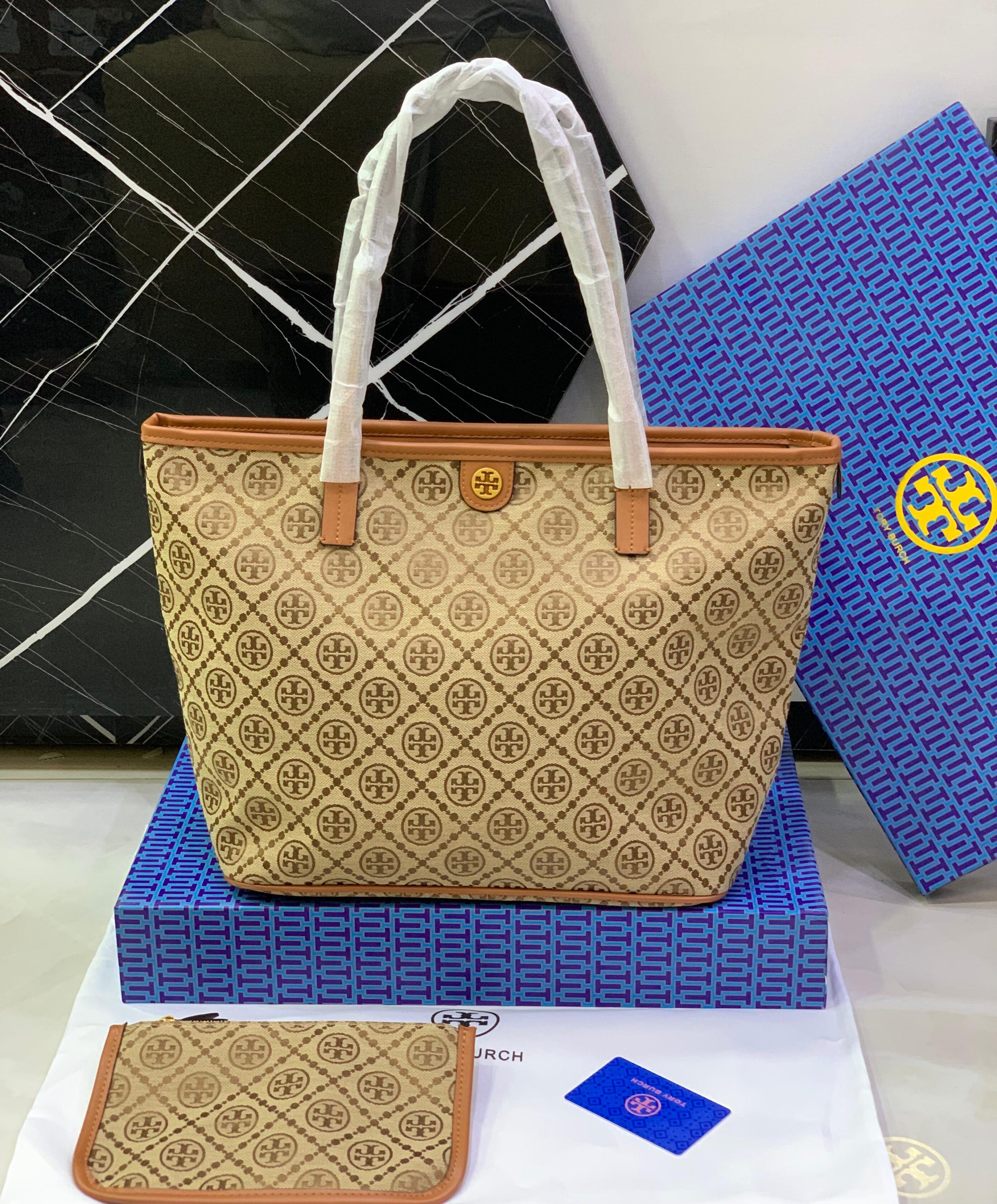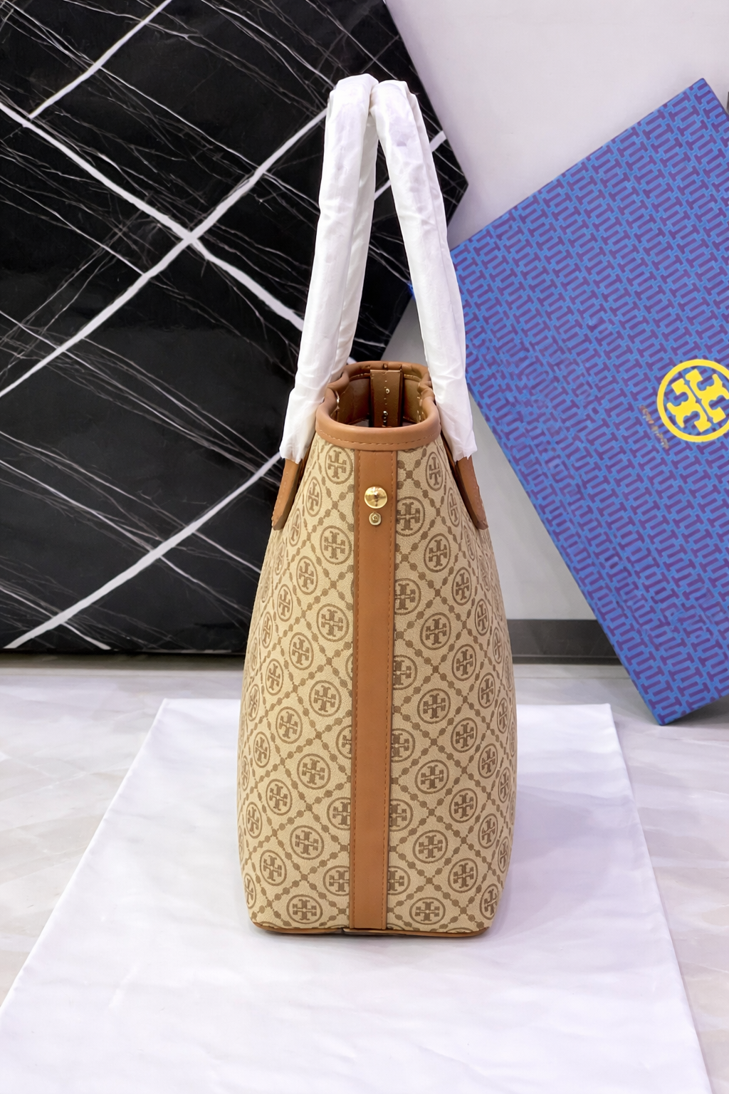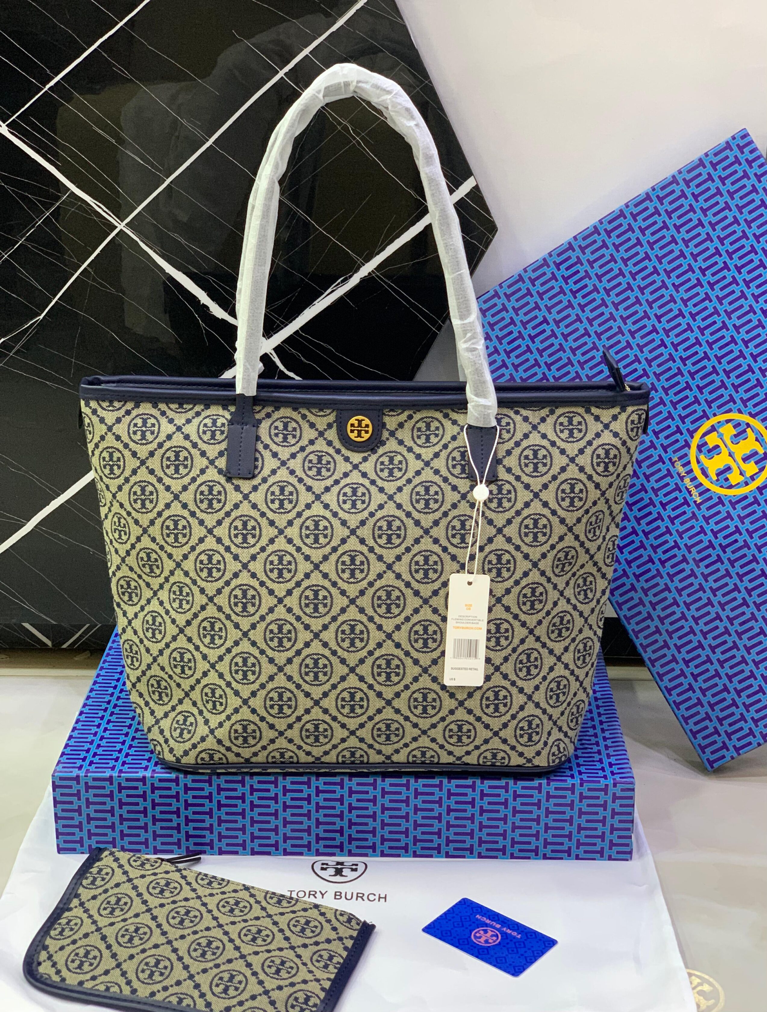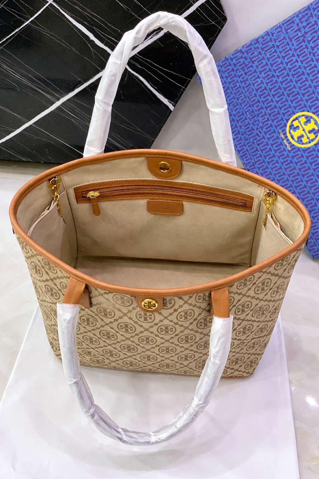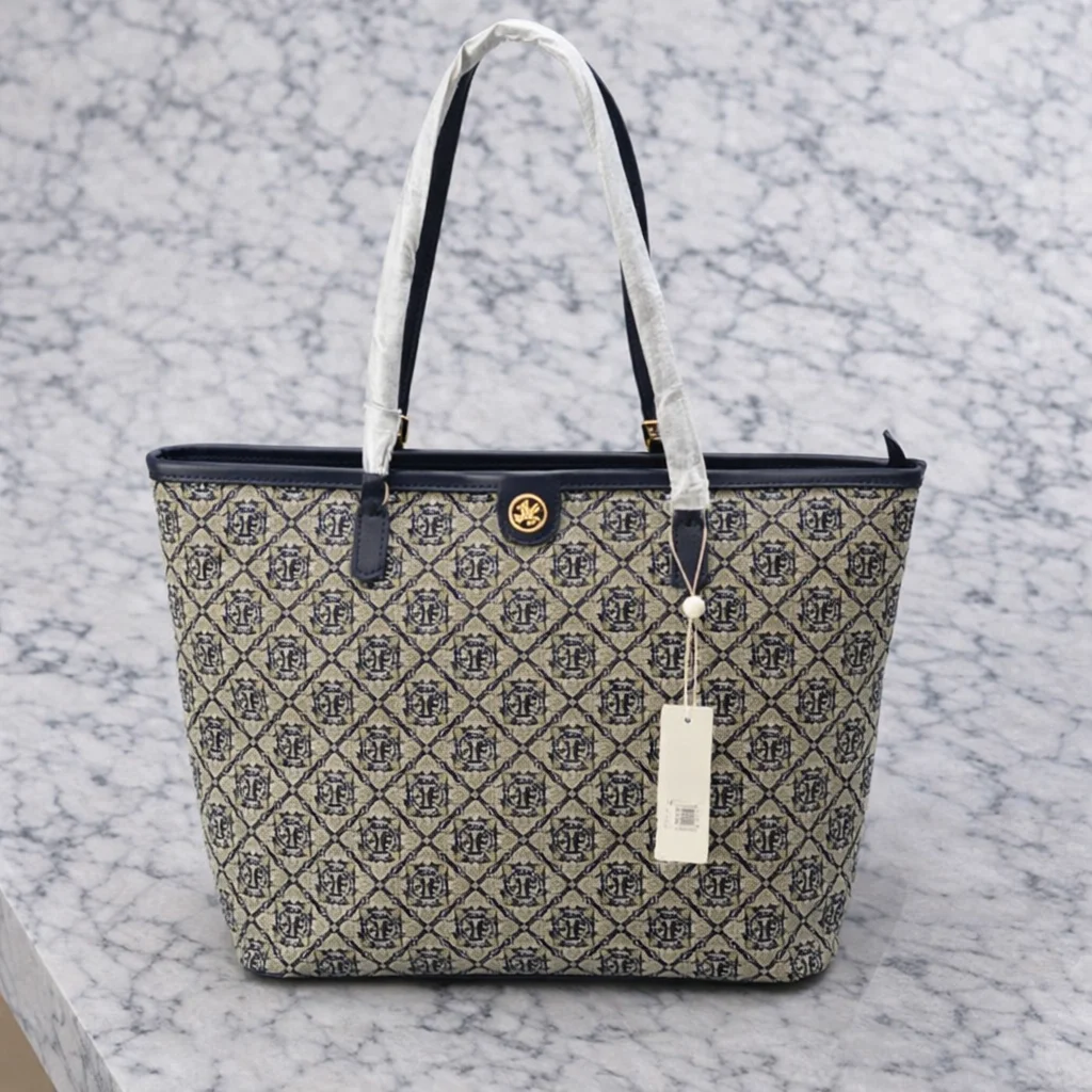 This Tory Burch T Monogram Jacquard Tote Bag showcases the brand’s iconic repeating T monogram pattern in a timeless, everyday tote silhouette. Designed for versatility and practicality, it combines durable jacquard fabric with smooth leather trim, making it ideal for work, travel, and daily city use. The spacious interior and structured shape offer both style and functionality.