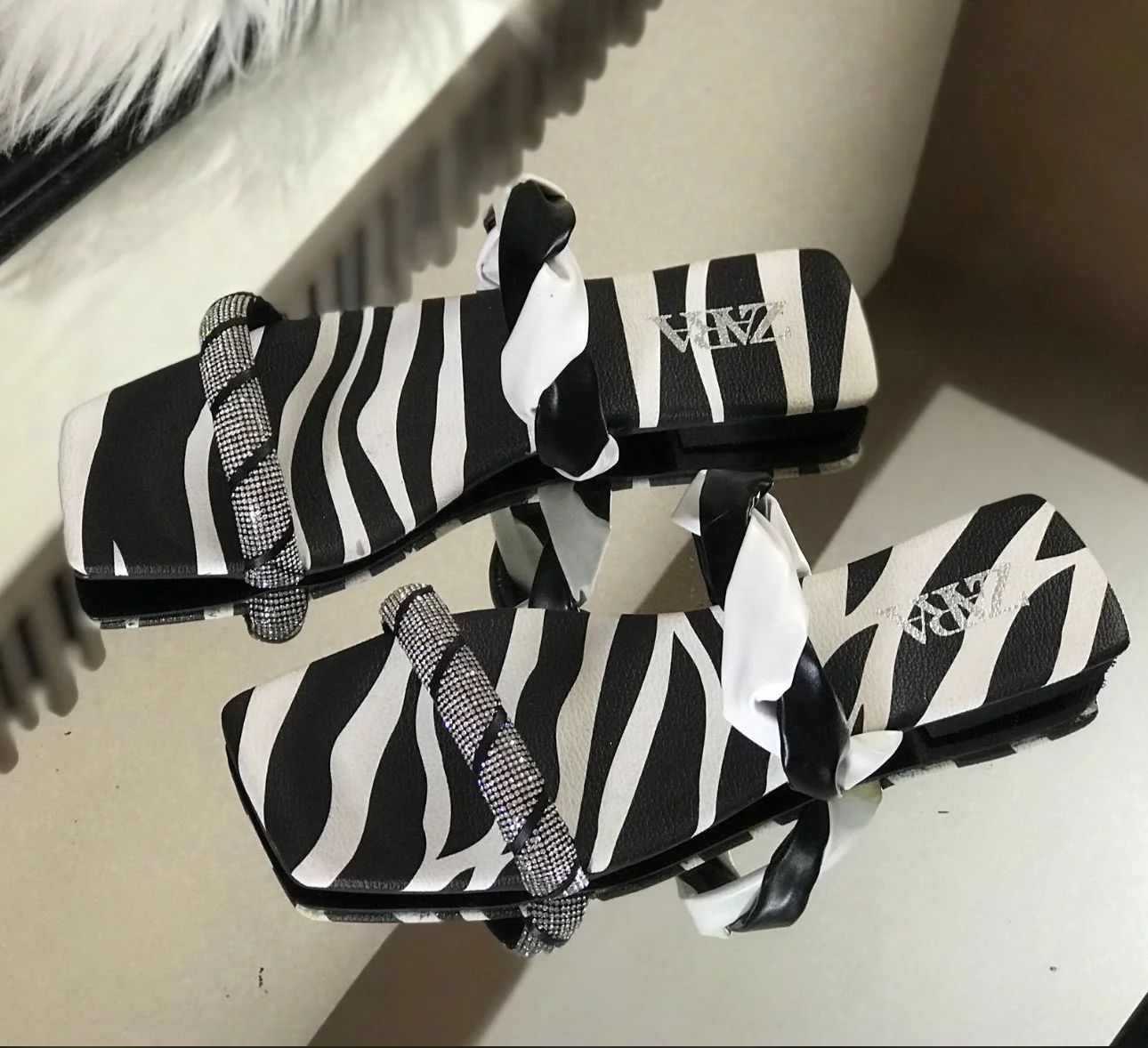 Fashion-forward flat slide sandals featuring a bold zebra print design with crystal bow detailing. Designed for stylish everyday wear, these flats combine comfort with a statement luxury-inspired look.